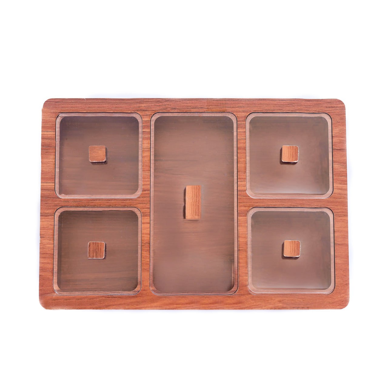 جعبه چوبی با لبههای صیقلی و پنج درب قندونی برای هر تقسیم، طراحی زیبا و قابل استفاده مجدد به عنوان ظرف دکوری.